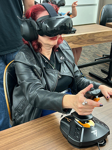 Attendees to a President’s Circle reception at Glendale Community College had the chance to experience virtual reality via new technology that college offers. Guests were escorted into a room outfitted with VR headsets and other materials, then transported to an “alien zoo,” a colorful place where, using a joystick, they moved about to examine the inhabitants – some that appeared sickly. Attendees, which ranged in age from an 8-year-old to those over the age of 70, reacted positively – and excitedly – to the VR experience.