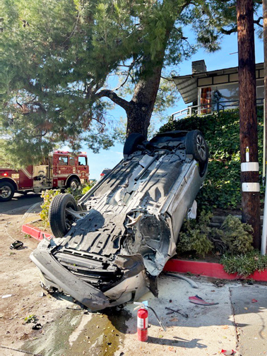 Luka proceeded to drive over 50 miles per hour north on Chevy Chase Drive where he turned onto Glenoaks Boulevard and collided with a curb causing his vehicle to become airborne and eventually land upside-down partially on a sidewalk. The vehicle quickly began to smoke, but GPD officers already on scene were able to extinguish the fire.