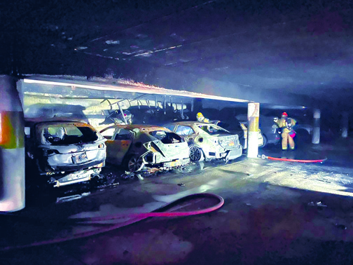 On Jan. 16 at 7:50 a.m., the Glendale Fire Dept. received a report of a fire in the parking garage of an apartment building at 2800 Montrose Ave. Upon arrival firefighters found heavy smoke coming from the parking garage located on the west side of La Crescenta Avenue and south of Montrose Avenue, with multiple vehicles on fire. The origin of the fire started with a single vehicle; the cause of the fire is under investigation. Five cars in total were a complete loss with as many as 40 other vehicles being affected. The parking structure has been red tagged. There were no injuries to residents or firefighters.