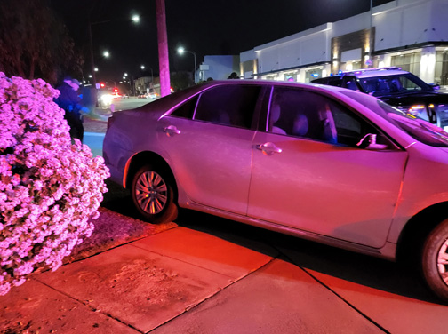 The vehicle, a silver four-door sedan, was facing west and was stopped in the center lane of Honolulu Avenue just west of the school. To Lukban it appeared civilians were talking to the male driver when he just drove away. In an apparent attempt to flee the area he turned around, heading east then hit the curb in front of Robbin’s Nest and came to a stop with the front of the vehicle facing east near the front entrance to the school.