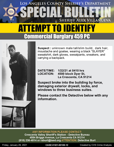 On Jan. 22 at approximately 4:10 in the morning, a male suspect broke into three businesses in the 4500 block of Dyer Street in La Crescenta. The suspect, as seen in surveillance video, was wearing a black “Slayer” sweater, dark gloves, sweatpants, sneakers, and a backpack. The suspect appeared tall and slim, with a moustache and goatee.