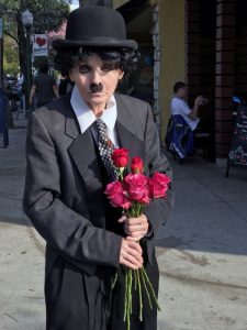 The Valentine’s Day tradition caught some shoppers off guard as Charlie Chaplin [performer Audrey Ruttan] walked up to them, dressed as his iconic “The Tramp” character, and handed them a rose. Kids pulled their mothers over to make certain they got the bloom for Valentine’s.