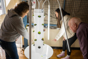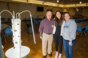 CVHS Principal Christine Benitez (left) and junior Kristyn Roh show donor Steve Pierce how the hydroponic garden works.
