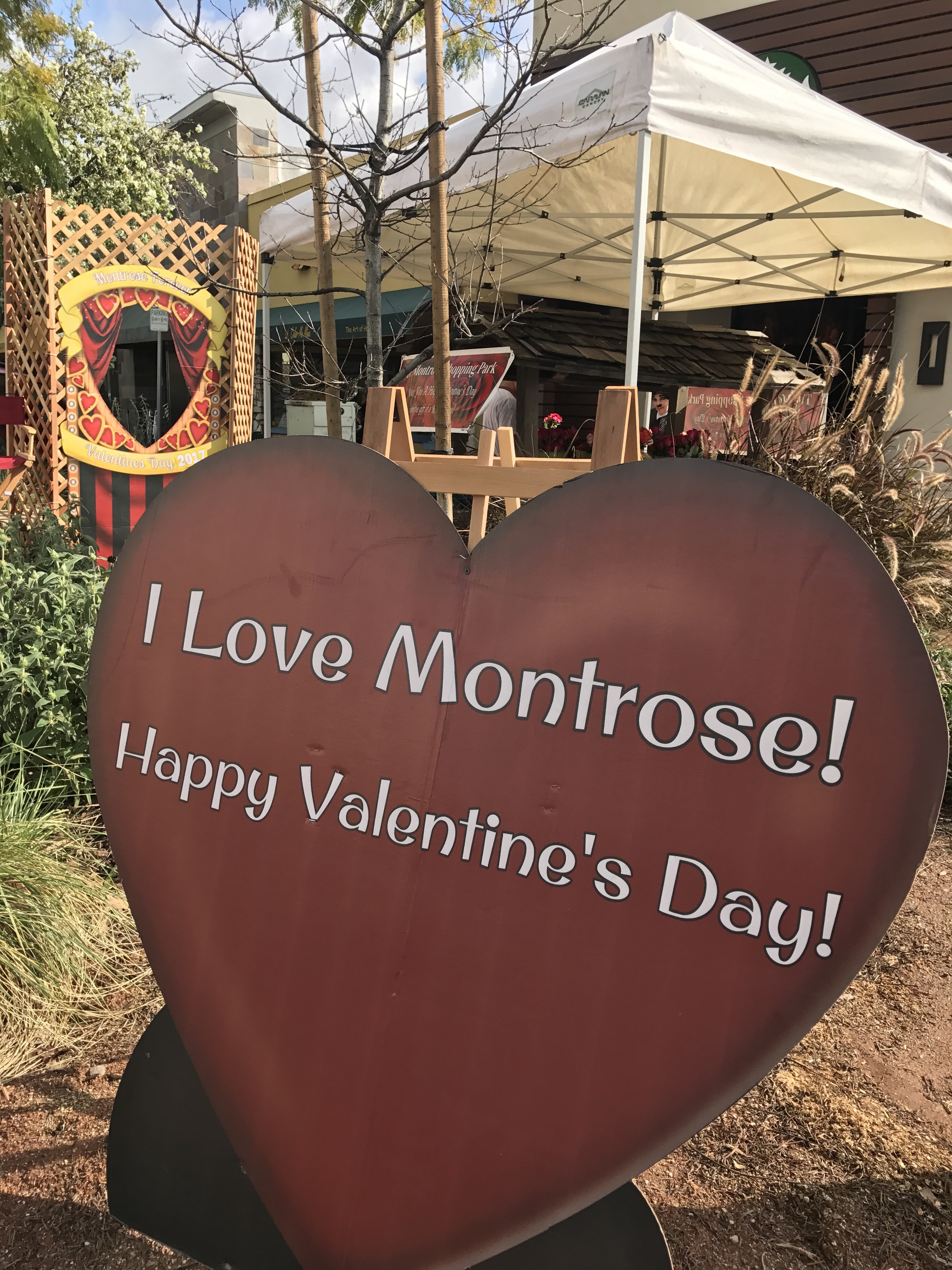 Tuesday may have been St. Valentine’s Day but it was over the prior weekend that the Montrose Shopping Park celebrated. On Saturday, Montrose Shopping Park Assn. members Steve Pierce and Dale Dawson, along with Charlie Chaplin impersonator Audrey Ruttan, handed out roses to all the ladies shopping and dining in the popular shopping park. Guests were also invited to stop and take photos in a specially made Montrose Valentine photo opp.