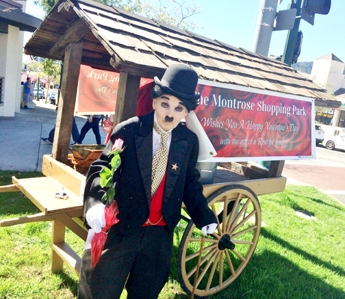 Montrose Shopping Park shoppers on Saturday were treated to a gift of a Valentine’s Day rose presented by Charlie Chaplin (actress Audrey Ruttan). The free long-stemmed roses were a big hit for passersby, and made possible by the Montrose Shopping Park Association.