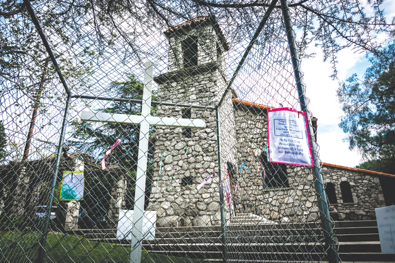 The church has erected a large wooden cross on its front lawn, but the interesting part comes from what surrounds it. The cross is housed in a box made of chain-link fence, but it isn’t to keep people away.
