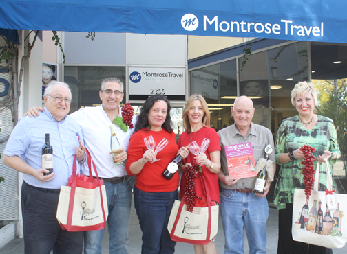 The Montrose Shopping Park Assn., which includes board members (from left) Ken Grayson, Andre Ordubegian, Gigi Garcia, Kim Kelly, Steve Pierce and Mary Dawson, stand in front of Montrose Travel, one of the “sipping sites” for the inaugural Montrose Wine Walk on March 18.