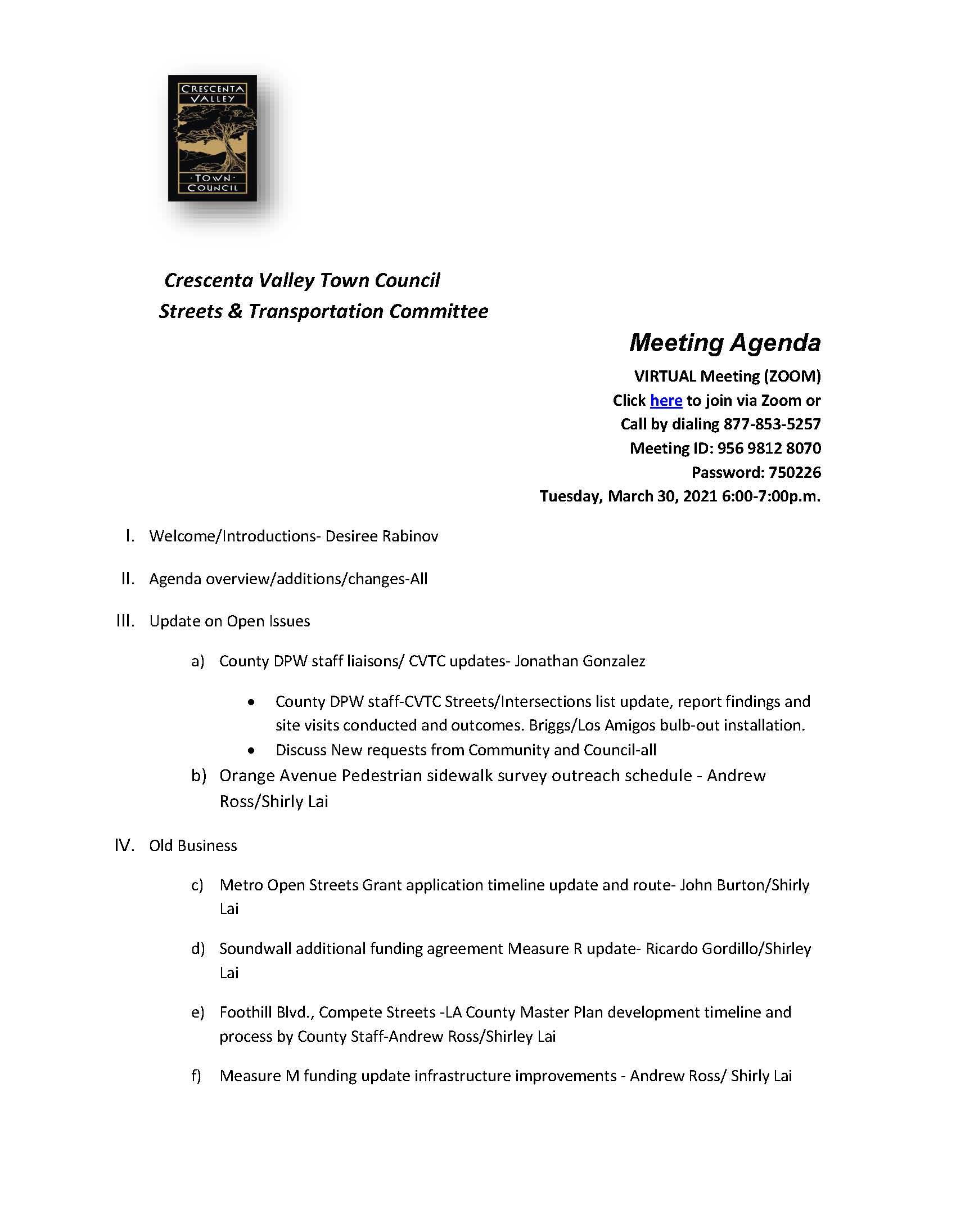 Agenda for CVTC Streets & Transportation Committee Meeting