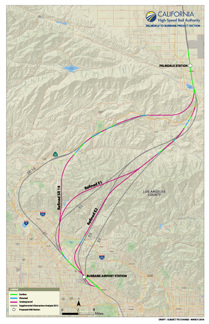 A refined set of Palmdale to Burbank alignment alternatives has been developed as a result of continued engineering and environmental technical evaluation, including environmental justice issues, as well as ongoing community and regulatory agency input. The three alignment alternatives that will be carried forward for study in the draft environmental document are: Refined State Route 14, Refined E1 and Refined E2. Specifically, according to the Authority, the alignment alternatives have been refined in order to, among other reasons, reduce and largely avoid environmental justice impacts in the highly-populated communities of Santa Clarita, Sylmar, San Fernando and Pacoima, reduce impacts in the Santa Clarita area, improve future high-speed rail operations on all the alignments under study by making them less circuitous thus allowing for more efficient, quicker service and improve the constructability of all the alignments under study by decreasing the amount of technically-challenging infrastructure.