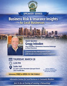 Gregg Inboden, local resident and vice president/commercial lines at Momentous Insurance Brokerage, will be addressing concerns and answering insurance questions on March 26 at 6 p.m. This presentation will be held on the campus of St. Luke’s of the Mountains Episcopal Church at Sadler Hall, 2563 Foothill Blvd.