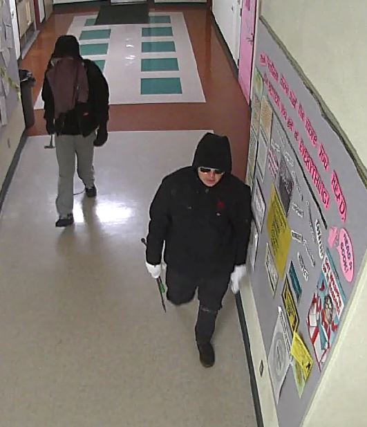 The investigation began on Saturday, March 12, at approximately 1:45 a.m., when three suspects forced entry to Toll Middle School located at 700 Glenwood Road. They roamed the halls carrying pry bars and hammers. The suspects disabled several security cameras by striking them with a hammer. The suspects forced entry to approximately 20 classrooms and offices where they searched for valuables. Most locked rooms were entered by smashing the door windows and reaching in to open the door. Cash was taken from one office and loss from classrooms is unknown.