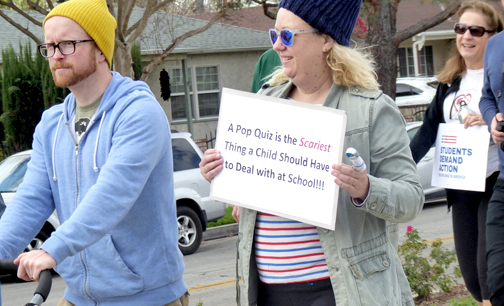 Greeting a student of hers with surprise, a Luther Burbank Middle School teacher exclaimed, “He’s in seventh grade! I’m so glad he’s out here. And this next group here,” she pointed to the next flank in a continuously flowing group of slow walking demonstrators, “these are teachers and students from Bret Harte Elementary. We’re here because we care about our kids, all of them. And they’ve asked us to support them. It’s what we need to do; and I couldn’t be more proud to do it.”