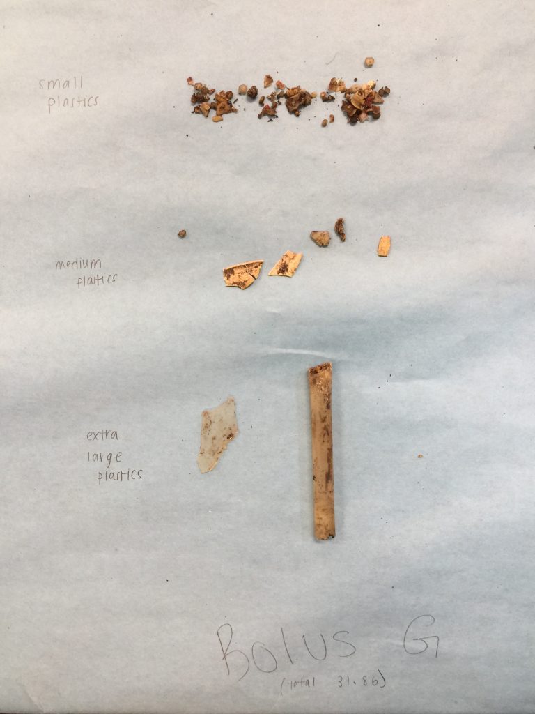 “I was very happy to have the vomit. We dissected [the boluses] last month and it went really, really well. We found a lot of plastics. Mussels have spacers in them and we found one of those spacers. We found screening from construction, we found fishing line, lots of little plastic bottle caps [pieces] and things like that. It was really interesting, actually,” Engen said.
