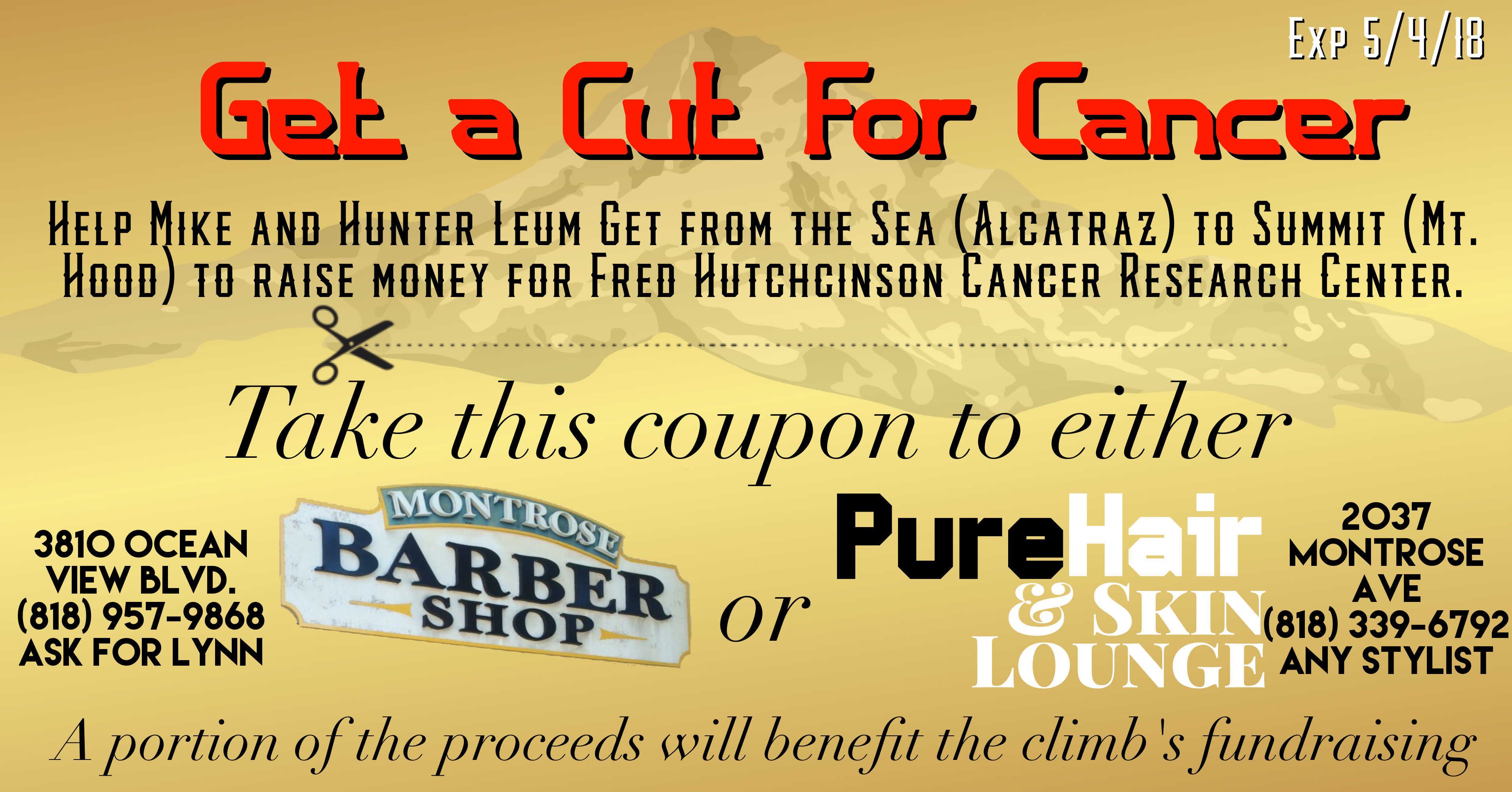Leum is teaming up with the owners of Pure Hair and Skin Lounge and The Montrose Barber Shop, Sara Lee and Lynn Thatcher, to offer coupons (below) with a portion of the proceeds going toward the climb. Leum’s goal is reaching $7,000. He said he’s halfway there.