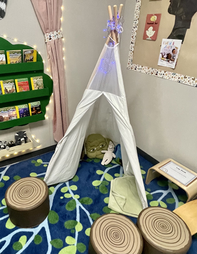The room was divided up into different sections. Tables were spaced throughout, each with different themes – some had puzzles and games like Jinga, another held art supplies. The most popular, though, was a table where kids could play with something called kinetic sand. Kinetic sand is a substance that feels like a like mixture of clay and sand and students loved digging their hands into it. Toward the back was an inviting reading area in the shape of a circle, made of small soft gray couches. On nearby shelves were books written for children on various self-care subjects. Posters on the wall encouraged children to get in touch with their feelings while simultaneously helping them determine what they are feeling. Other sections of the room included a teepee and a beanbag chair where students could meditate or nap.