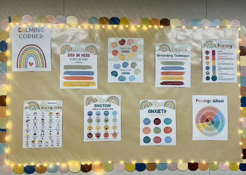 The room was divided up into different sections. Tables were spaced throughout, each with different themes – some had puzzles and games like Jinga, another held art supplies. The most popular, though, was a table where kids could play with something called kinetic sand. Kinetic sand is a substance that feels like a like mixture of clay and sand and students loved digging their hands into it. Toward the back was an inviting reading area in the shape of a circle, made of small soft gray couches. On nearby shelves were books written for children on various self-care subjects. Posters on the wall encouraged children to get in touch with their feelings while simultaneously helping them determine what they are feeling. Other sections of the room included a teepee and a beanbag chair where students could meditate or nap.