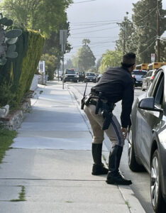 One big issue around schools is drivers who make U-turns. While in front of Crescenta Valley High School, a driver made a U-turn after dropping off a student at the front entrance. There are no U-turns allowed in front of the school. Bay turned on the patrol lights and pulled the driver over. The driver said s/he was in a hurry and the passenger in the car was not feeling well. Bay said he understood but it is still a violation.