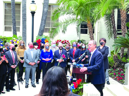 Congressman Adam Schiff, with other dignitaries, address a group of Armenian supporters and media representatives in front of Burbank City Hall on Saturday following the recognition of the Armenian Genocide by President Biden.