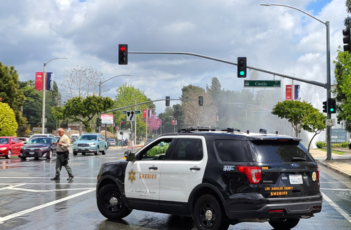 The break caused a waterspout to shoot into the air. Los Angeles Sheriff’s Dept.-Crescenta Valley Station received several calls about 2:04 p.m. and temporarily blocked traffic on Foothill Boulevard until water crews arrived.