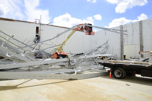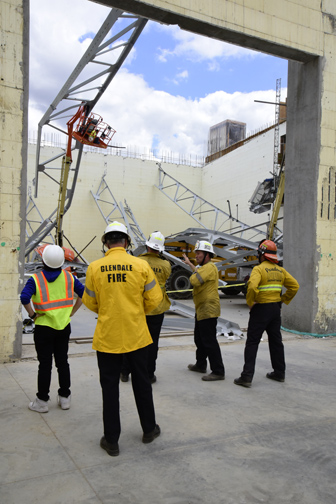 He added firefighters responded to the massive steel web truss spanning the building, about 100 feet by 300 feet, which all at once failed. Agencies assisting Glendale included Pasadena, Burbank, San Marino and two helicopters from Los Angeles Fire Dept. In all, 75 firefighters responded.
