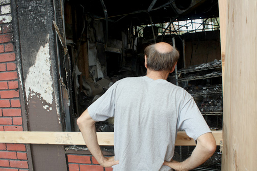 Photos by Michael J. ARVIZU Deborah Goodale and husband Reno survey the damage to the Backdoor Bakery and Cafe on Wednesday. The business was gutted in an early morning blaze on May 11.