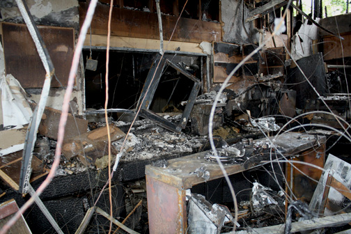 Clouds darkened the sky, and it was a little chilly, adding poignancy to the already blackened walls, melted furniture and water-damaged floor.