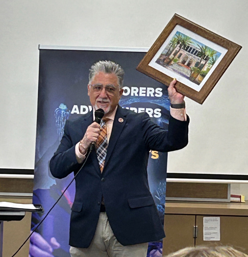 State Senator Anthony Portantino holds up a watercolor of the GCC campus, done by a Crescenta Valley High School student, given to him in appreciation for his work in securing funding for the virtual reality technology at the college.