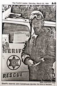 Looking back over his years with Montrose Search and Rescue Camphouse recalled one call in particular that stuck with him. A private plane crashed near Mendenhall Peak in Sunland-Tujunga that involved four young males who took off from Whiteman Airport in Pacoima. Only one of the men was able to hike out to request help; the search and rescue team brought up the other three in litters. Camphouse found the call memorable because most small plane crashes prove fatal for the pilot and passengers; in this one all survived.