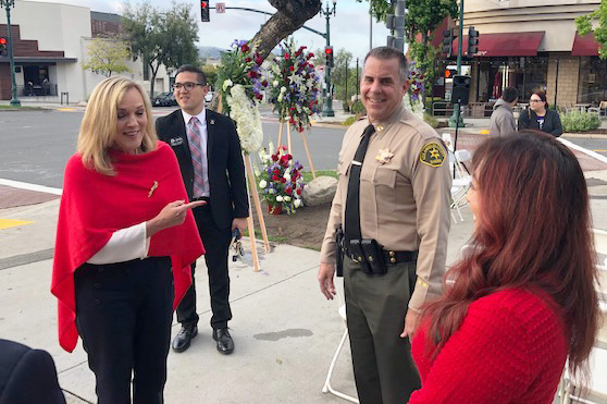At the Memorial Day observance at the Vietnam Veterans Memorial, County Supervisor Kathryn Barger (left) chats with new CV Sheriff’s Station Captain Todd Deeds and Montrose Chamber executive director Victoria Malone.