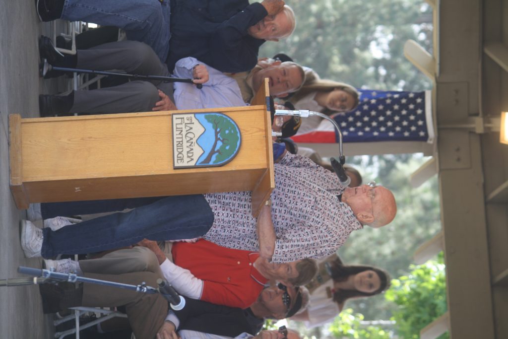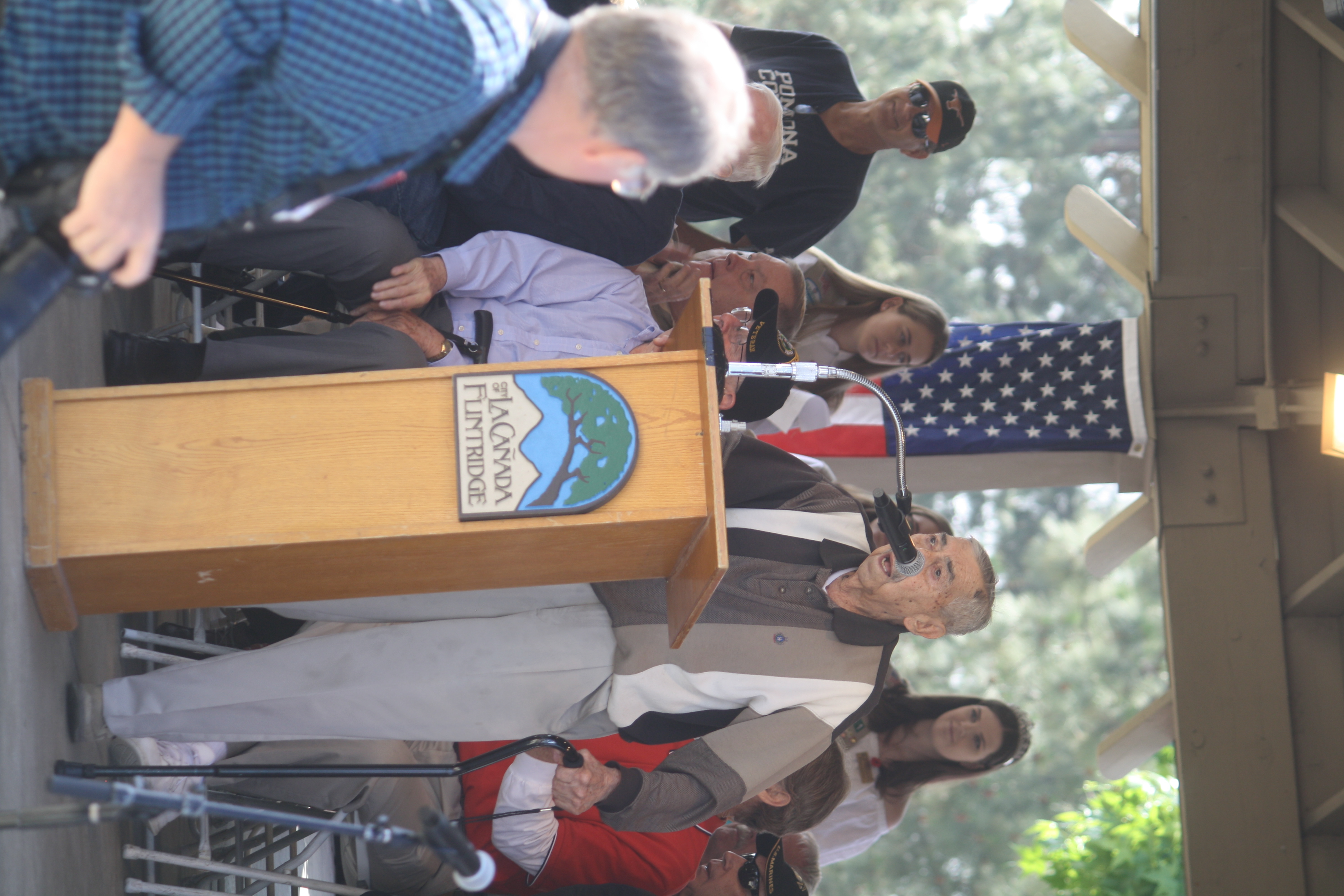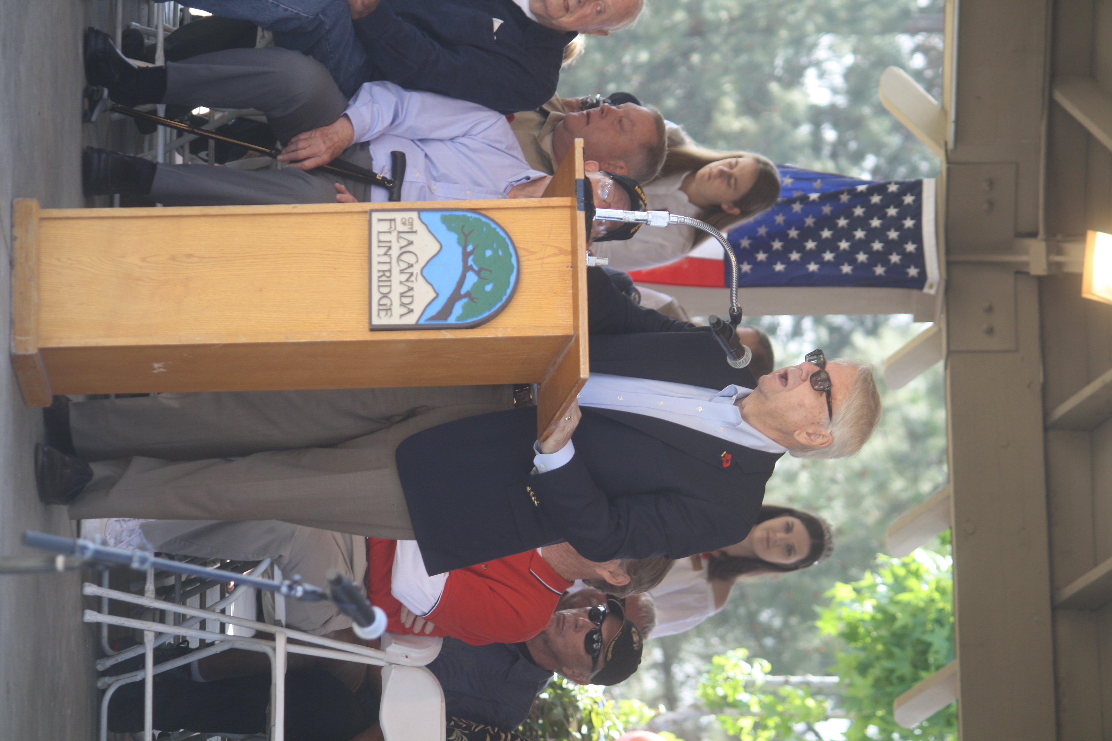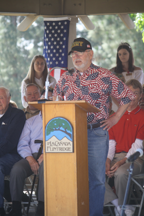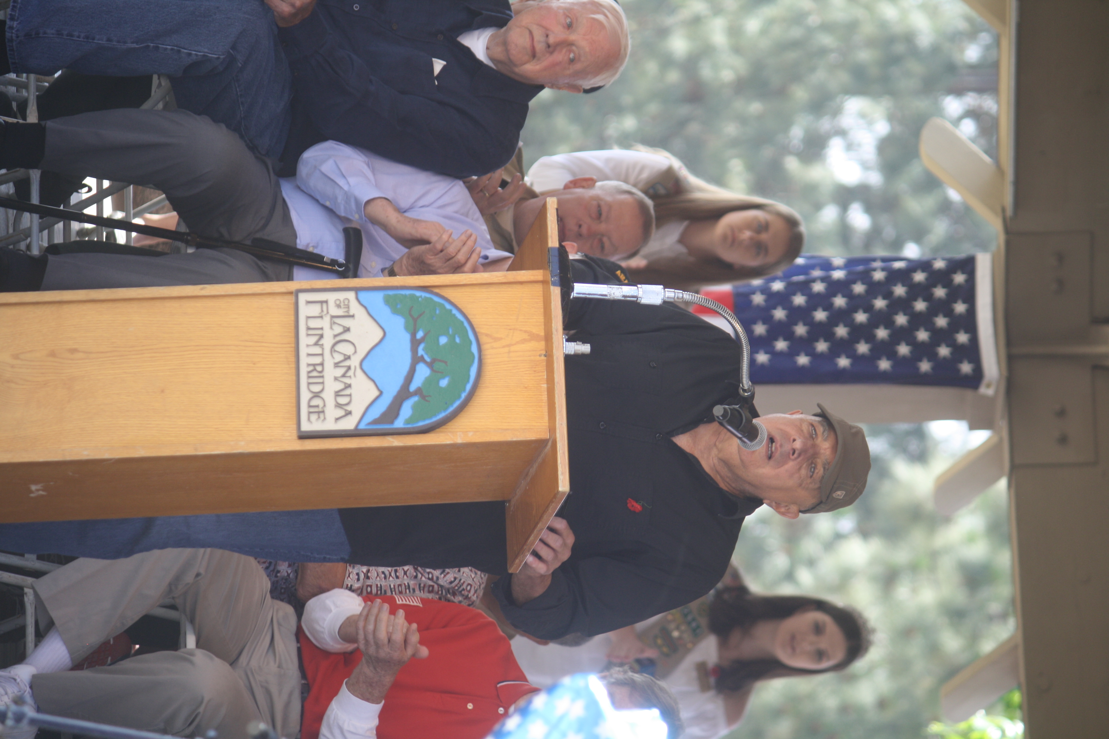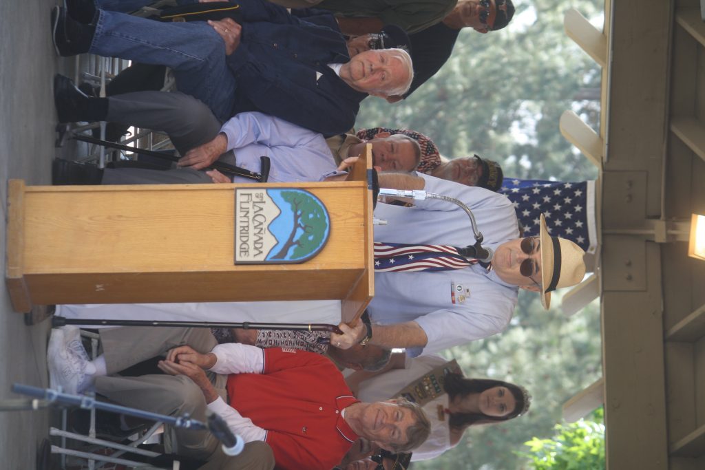 At Two Strike Park in La Crescenta another observance was held for the community. The service was centered around the Memorial Wall, which was installed as a joint effort between the Veterans of Foreign Wars Post 1614 and the American Legion Post 288 to honor the local resident servicemen who were reported missing or killed in action during World War II, the Korean War, the Vietnam War and the Iraq War. This year, the keynote address was delivered by Capt. Ralph Scaffidi, U.S. Navy Reserve – Retired. He gave a bit of history, entwined with personal observation, and summed up the holiday perfectly.