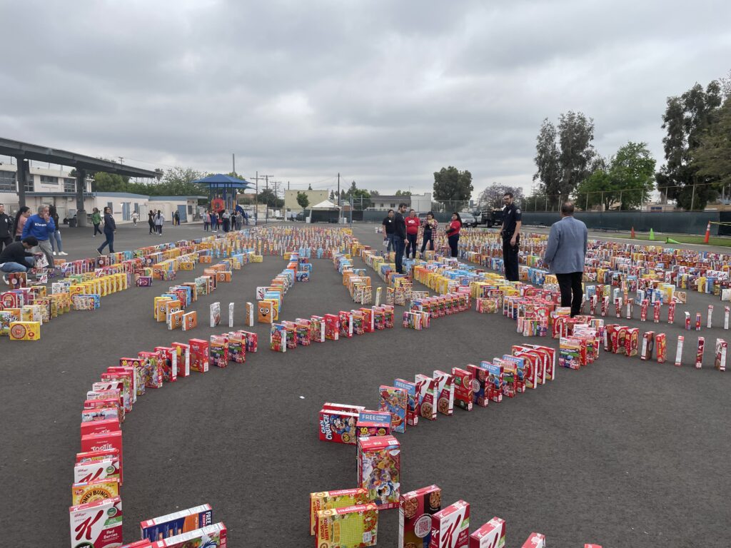 Donated boxes of cereal line the campus of Thomas Jefferson Elementary School in Glendale. Parents, students, police officials, and school staff are ready to take part in the fundraiser that involves the toppling of the cereal boxes in a domino like fashion.