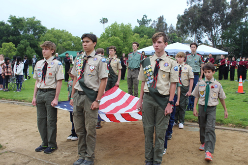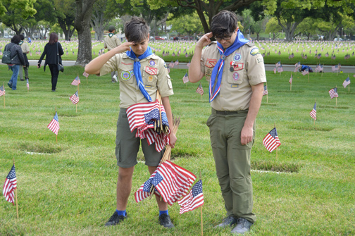Also on Saturday, members of local Boy Scout Troop 319 headed to the Los Angeles National Cemetery to help place over 80,000 American flags on the gravesites of veterans. Accompanying them were parent helpers TL Cheryl Leu Sinclair, ATL Debey Dick, ASM Nicolas James, ASM Rob Vogt, Joy and Tim Stone, Creighton Papier and Natalie Ouwersloot. The Scouts joined hundreds of Boy Scouts and Girl Scouts from the Western Los Angeles County Council in the annual Memorial Day observance.