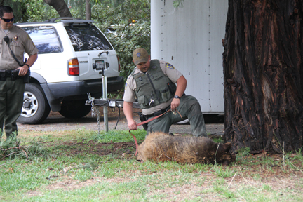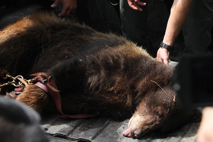 The bear, resting on a branch about 30 feet up in the tall pine tree, was shot with a tranquilizer dart and sprayed with a fire hose to try and dislodge her. She fell from one branch to another, slowly managing her own descent through the haze of tranquilizer, before reaching the ground with only about an eight-foot-drop from the lowest branch. She landed on the ground unharmed and was allowed to fall fully asleep before being lifted onto a transport truck.