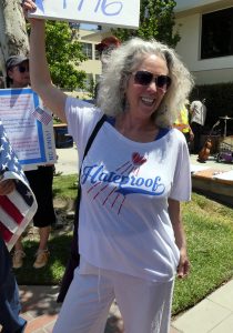 Self-described Eagle Rock “middle class white lady teacher” Kate McFadden said she was there because “we’ve never seen this level of tyranny.” McFadden wore a Dodgers-inspired shirt that read Hateproof.