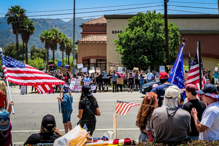 The two organizations faced off, yelling slogans across the street at each other maintaining a peaceful, albeit loud, protest. Los Angeles Police Dept. received calls throughout the day concerning everything from indecent exposure to gunfire. The police investigated but found no evidence of those incidents.