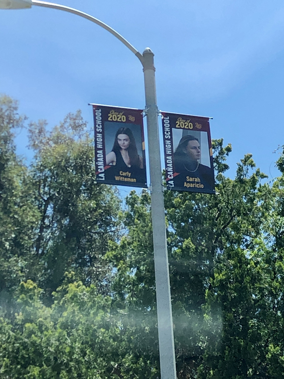 Traveling on Foothill Boulevard in La Cañada, banners honoring graduating La Cañada High School seniors are proudly displayed.