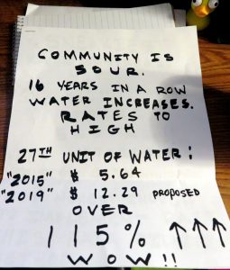 Michael Chonos had previously spoken at a public hearing on the proposed rate hikes. At Tuesday’s meeting, he handed out a two-page handwritten communique that stated, “Community is sour. 16 years in a row water increases. Rates to [sic] high.”