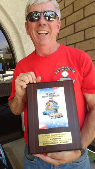 Mark Davis, whose Trans Am was featured on the car show advertising, shows off his plaque acknowledging his contributions to promoting the car show.