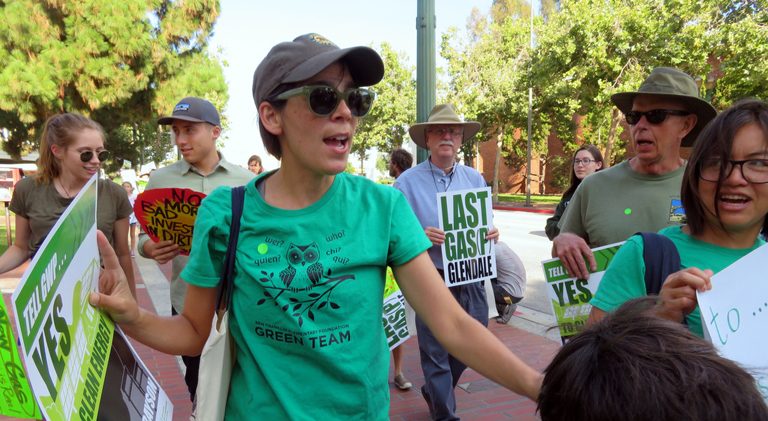 A speaker addresses the crowd at the rally prior to the Glendale City Council meeting organized by the Glendale Environmental Coalition.