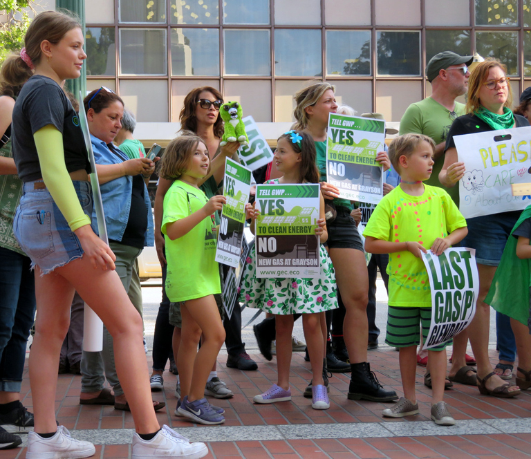 Glendale resident Madeline Frey, 12, addressed the crowd of approximately 370 children and adults outside Glendale City Hall Tuesday night to oppose the repowering of the Grayson power plant with gas of any amount.