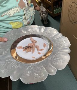 Jessica Palacios (left) watches over Pippi as she enjoys her cat treat on a silver tray.