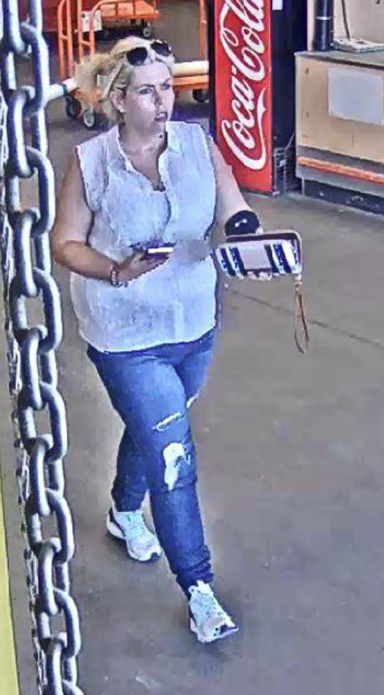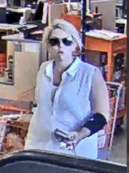 The suspect is described as 28-38 years old, dyed blond hair, medium build, wearing a black sport band on her left forearm.