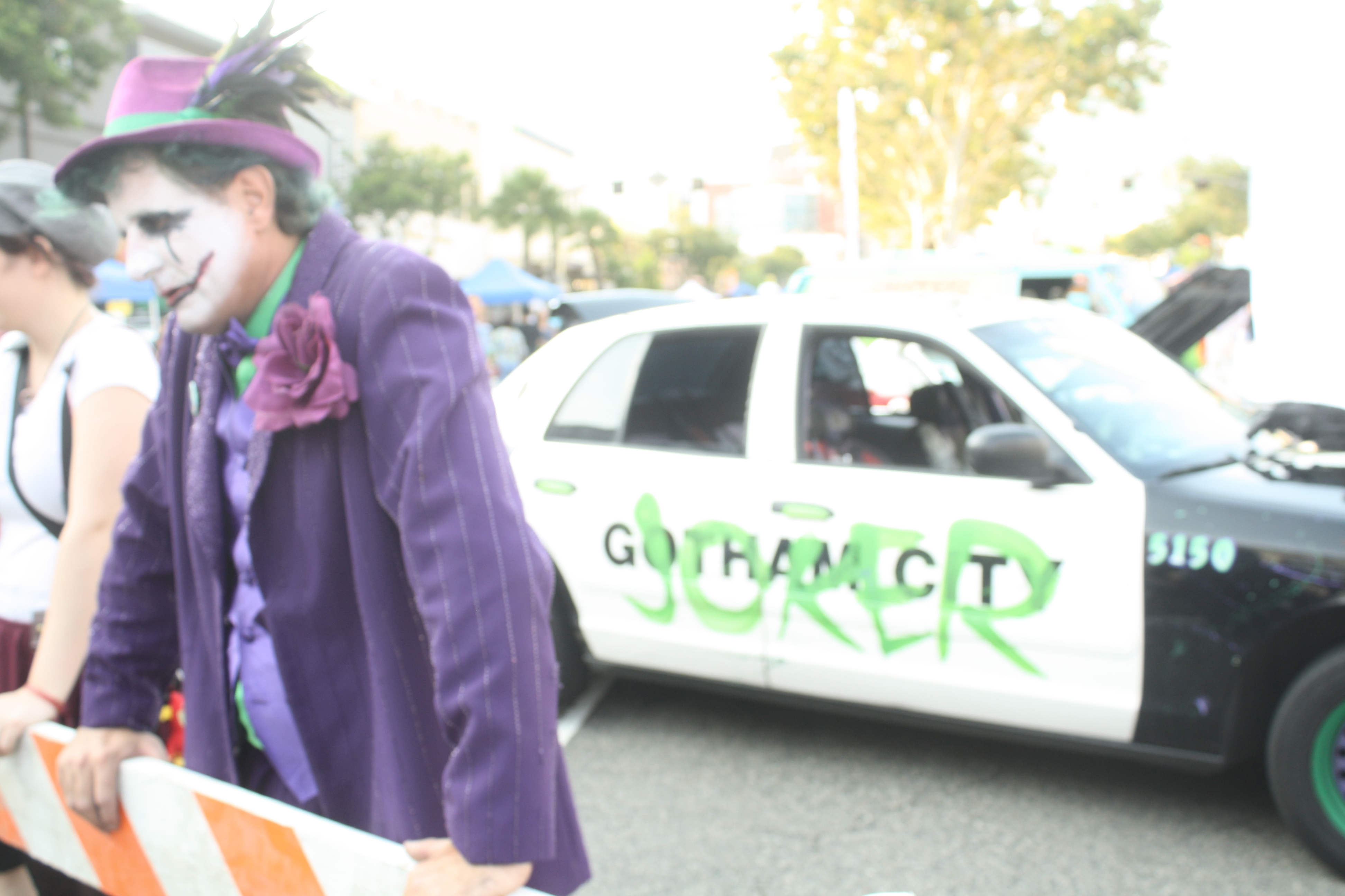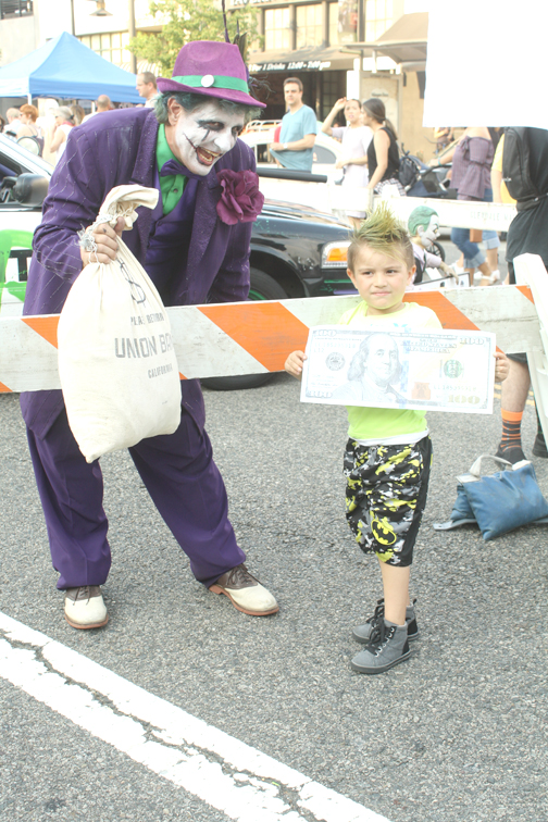 The Joker from the Batman series and 4-year-old Kain Rubio compared their moneybags in front of a Gotham City PD cruiser that the Joker had emblazoned with his name.