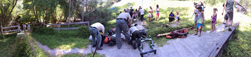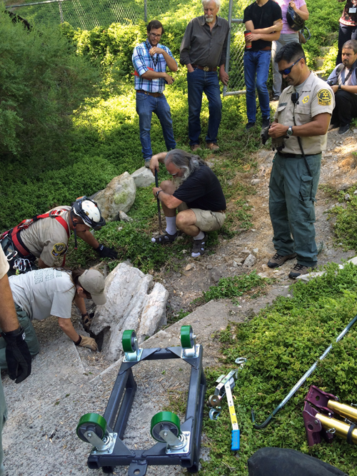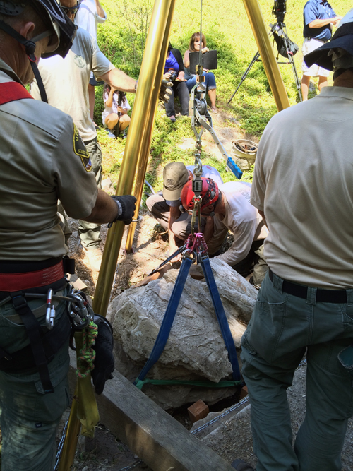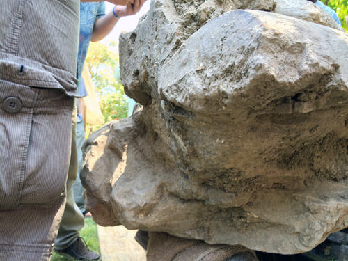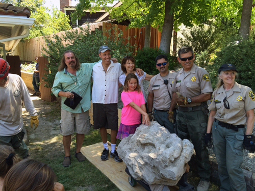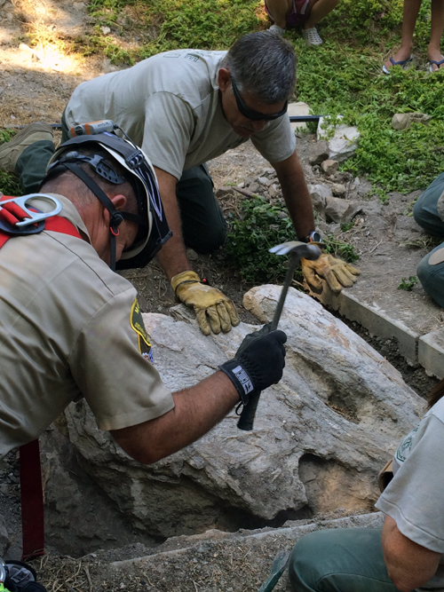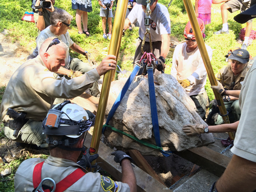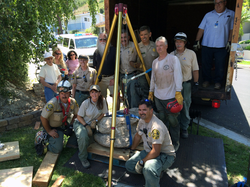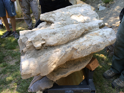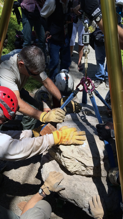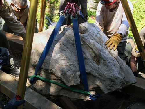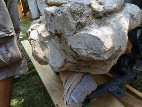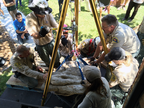 After sitting in the same spot for 36 years, it was up to the MSR team to get the fossil up the long incline from the canyon, through a neighboring yard and to the waiting truck on the street. Using several straps to secure the fossil boulder, the entire 996 pound specimen was lifted using a tripod called the Arizona Vortex and moved just a few inches. After three very deliberate and delicate lifts, it was finally placed on a specially designed trolley cart, the FRV – Fossil Recovery Vehicle. The FRV was then tied to a pulley system using anchors in the neighboring yard and pulled up the steep hill by the members of the MSR team. Once at the top of the hill, the team changed directions and pulled it up a second, less steep grade to the neighboring yard that was, thankfully for the team, flat. Then the specimen was rolled on a plywood track to the truck where the Arizona Vortex once again transferred the fossil from the FRV onto a wooden pallet for transport to the museum. Once at the museum, the pallet was moved by forklift.
