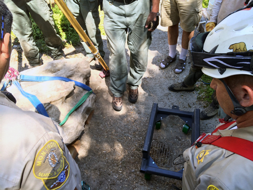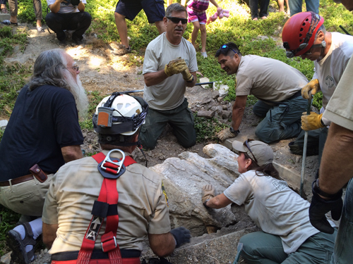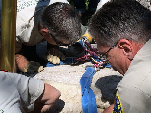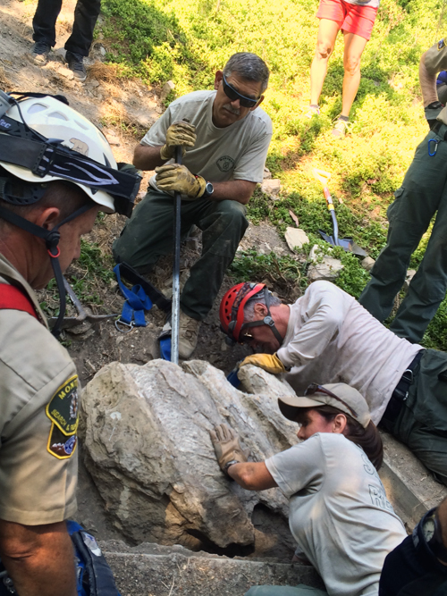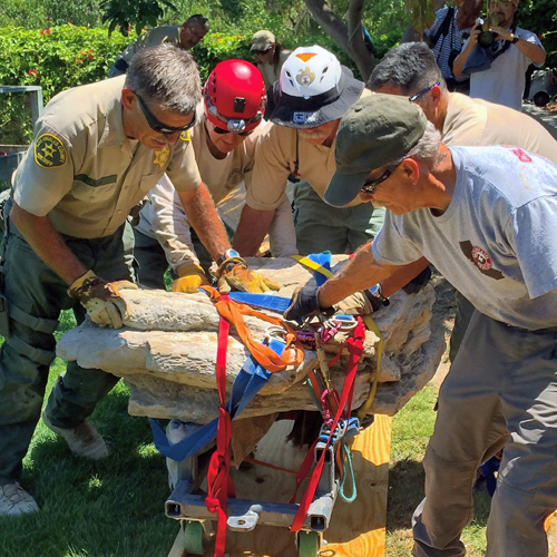 Members of the Montrose Search and Rescue team surround the fossil of the baleen whale gently lifting it with the Arizona Vortex.