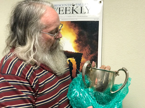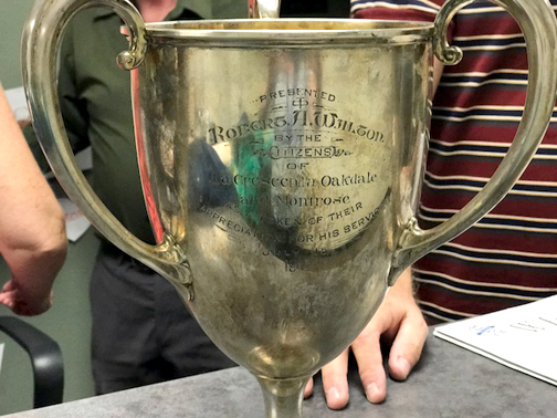 In 1915, the citizens of the newly-formed town of Montrose honored the man who was responsible for their town’s existence. Robert Walton was a local real estate agent who, along with his partner J. Frank Walkers, co-founded Montrose. Walton was given a silver cup that was engraved with the message “Presented to Robert A. Walton by the Citizens of La Crescenta, Oakdale and Montrose as a token of their appreciation for his service July 15, 1915.” Walton moved away from the area, taking the cup with him. Though it seemed that the cup would be gone from the area forever, recently an antiques dealer in Maine came across the cup. He contacted the Historical Society and offered the cup for a price of $1,650.