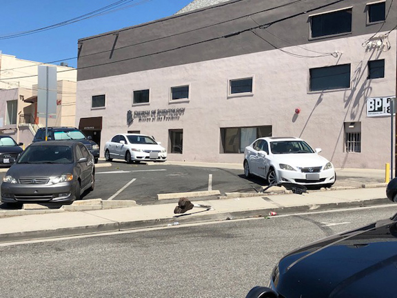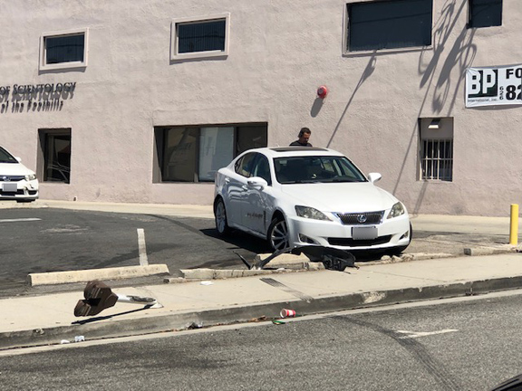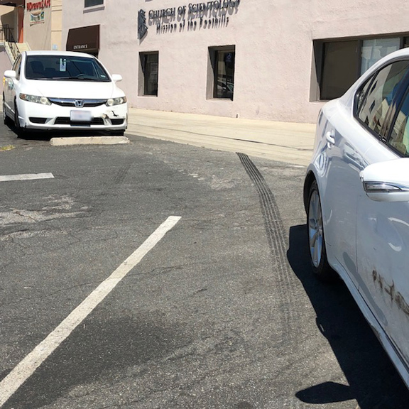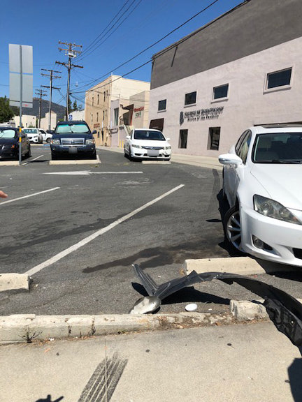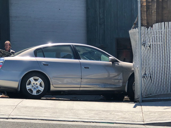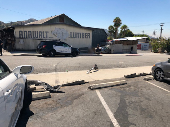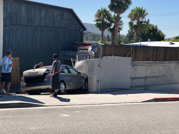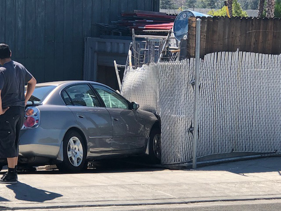 On Wednesday morning around 11 a.m., an elderly driver was pulling out of her parking space at the east end of Montrose Parking Lot No. 7 when she apparently lost control of her vehicle, damaging two other vehicles in the lot before shearing off a parking meter then traveling across Market Street and crashing into the southwest corner of the Anawalt Lumber building.