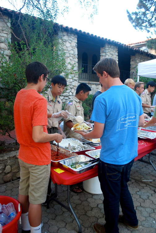 Tables were set up outside of the church near the playground area, giving adults the chance to sit and talk and kids the opportunity to play safely nearby. An assembly line service was available for piling tacos high with whatever toppings guests desired. From beans to meat, lettuce to sour cream, guacamole to salsa – these Boy Scouts had it all!