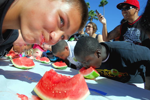 Photos by Michael J. ARVIZU Contestants vie for the top watermelon eater spot during the 52nd annual Sunland-Tujunga Lions Club Watermelon Festival at the Rose Bowl in Pasadena on Saturday.