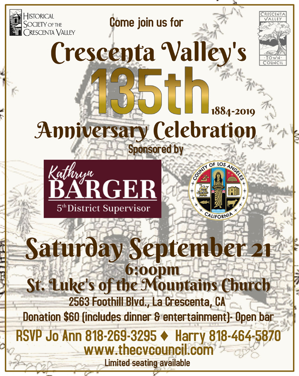 “If you don’t celebrate your history, you don’t have a future, and this community has a lot of history,” said Crescenta Valley Town Council President Harry Leon, sharing his vision for the celebration of the Crescenta Valley’s 135th “birthday” event planned for the evening of Saturday, Sept. 21. It will be held at one of the area’s oldest buildings, St. Luke’s of the Mountains Episcopal Church at 2563 Foothill Blvd.